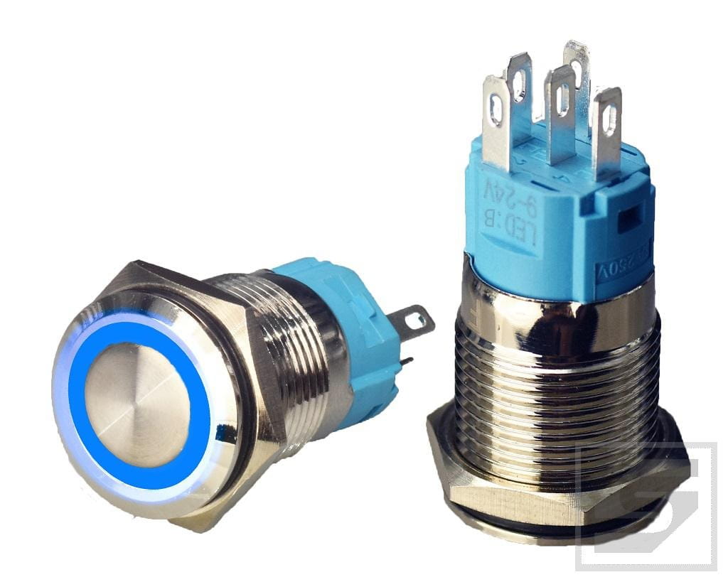 LB16MR-BL; przełącznik przycisk, POWER podśw. 9-24V niebieskie; mont.16mm; chwilowy