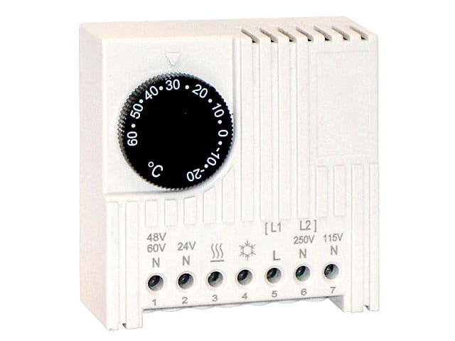 Termostat regulowany w zakresie -20°C do 60°C, stosowany w systemach chłodzenia do sterowania pracą wentylatorów oraz systemów ogrzewania. Idealnie nadaje się do montażu w szafach rozdzielczych, sterowniczych.